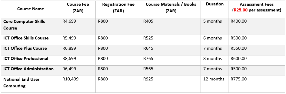 A registration fee of R800.00 (Eight Hundred Rand) is payable upon registration for all courses. This fee is separate from and payable in addition to the course fee.